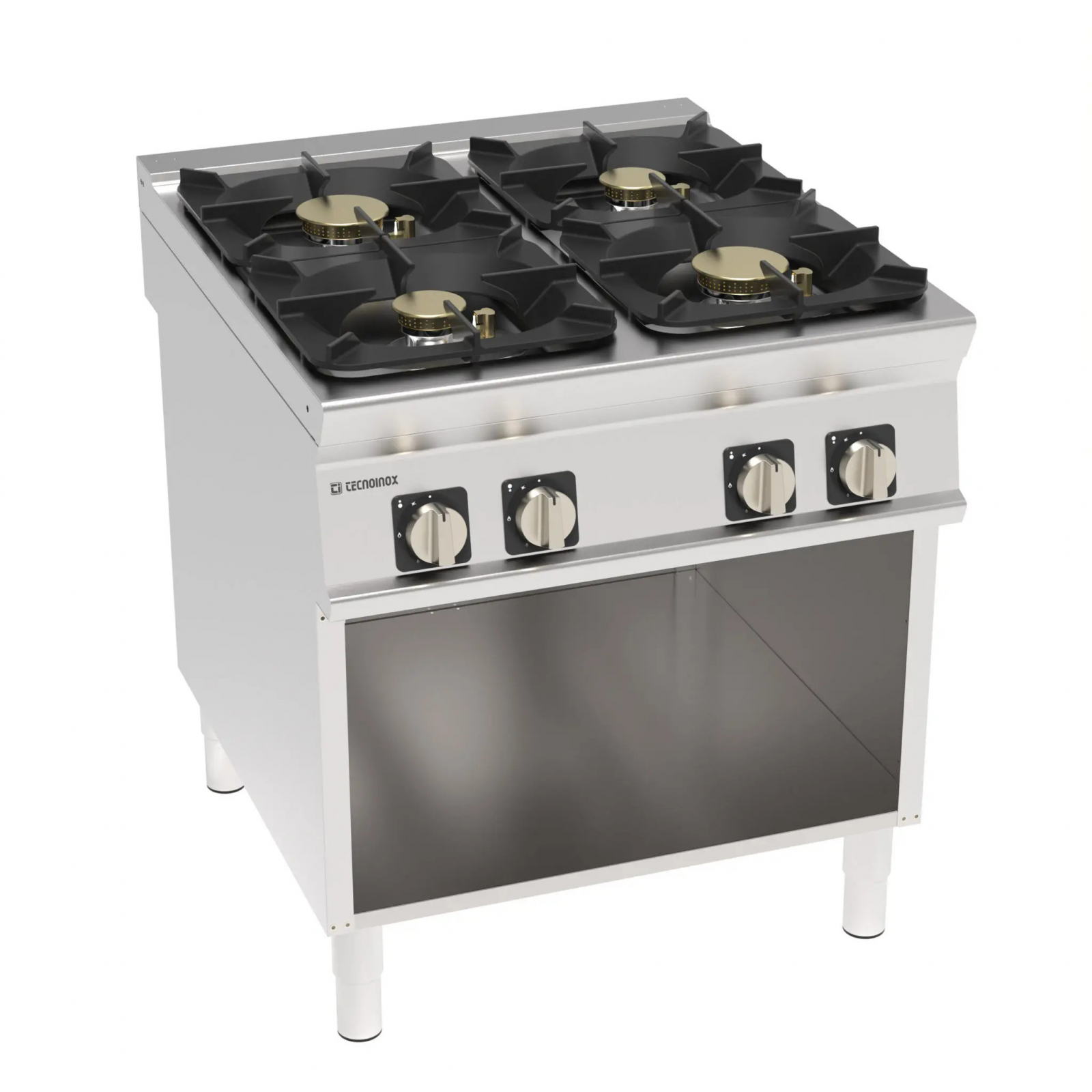 Masina de gatit cu 4 focuri, pe suport neutru deschis, structura inox AISI304 cu blat superior de lucru grosime 1,5 mm, putere arzatoare 2x6kW, 2x10kW, termocupla de siguranta si flacara pilot, valva de siguranta gaz, suport de oale din fonta cu brate lungi, butoane foarte solide si rezistente in timp, picioare reglabile in inaltime.