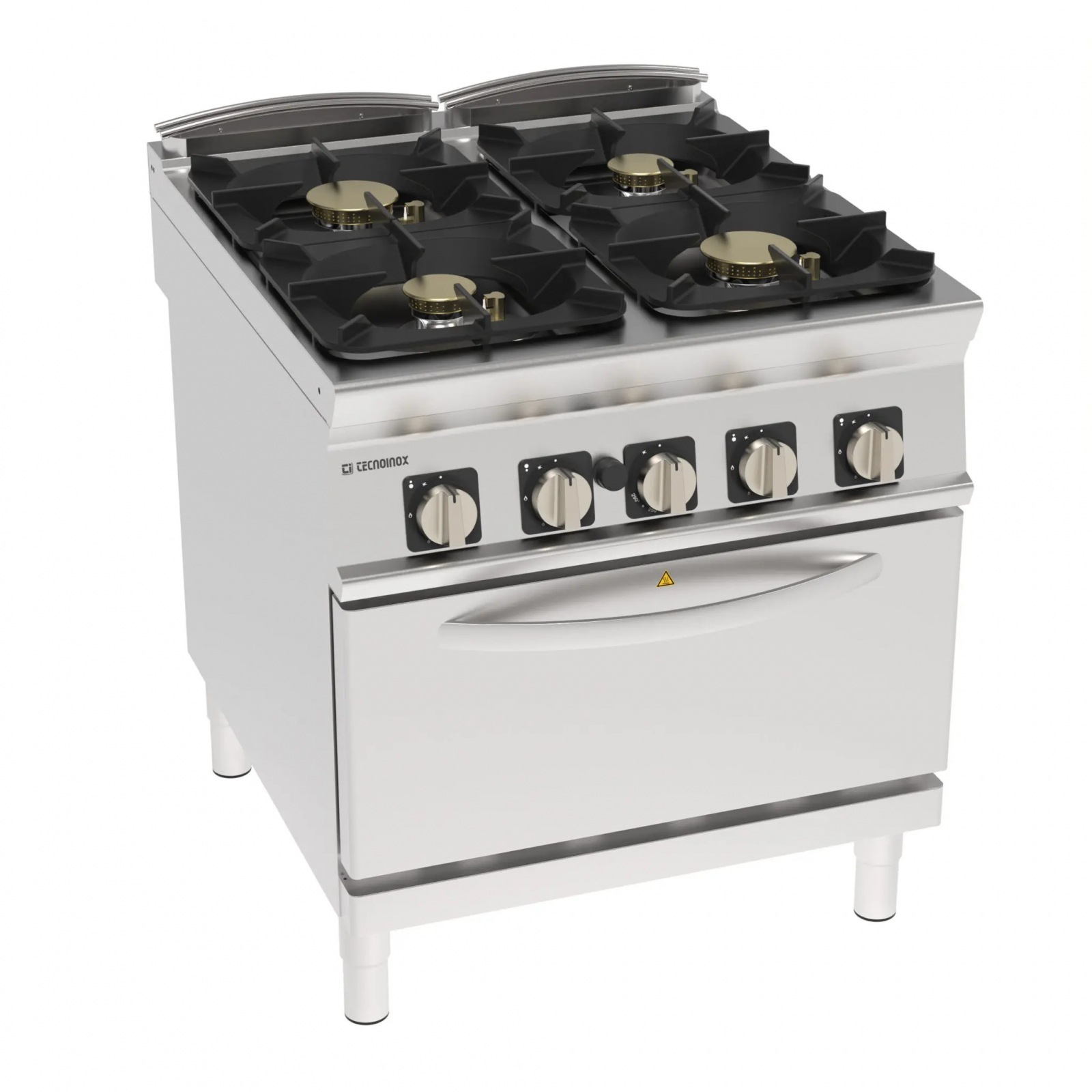 Masina de gatit cu 4 focuri si cuptor, structura inox AISI304 cu blat superior de lucru grosime 2 mm, temperatura de functionare a cuptorului 150°C-290°C, capacitate cuptor 4xGN 2/1, putere cuptor 7kW, arzatoare ermetice, putere arzatoare 2x10kW-2x6kW, valva de siguranta gaz, arzatoare din alama fixate ermetic de blatul superior cu inaltime mare sub ele pentru curatare usoara, suport de oale din fonta cu brate lungi, butoane foarte solide si rezistente in timp.