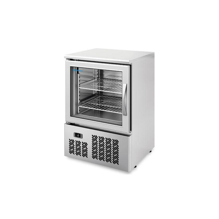 Congelator pentru pahare cu 1 usa batanta din geam tip termopan, structura inox AISI304, iluminare interna cu LED, volum intern 95 lt, temperatura de lucru -5ºC/-10ºC, 2 polite interne 400 x 430 mm ajustabile in inaltime, racire prin condensare fortata si sistem de evaporare static, agent refrigerant ecologic R290, control electronic