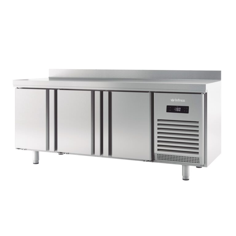 Masa congelare cu 3 usi, volum 385 lt, rebord 100 mm la perete, temperatura de lucru -18°C, racire ventilata, gaz refrigerant R290, clasa climatica 4 - agregat tropicalizat +38°C, picioare din inox reglabile pe inaltime, structura inox AISI304, 3 polite interne 325x430 mm ajustabile in inaltime, clasa de eficienta energetica D, consum zilnic 6,57kW.