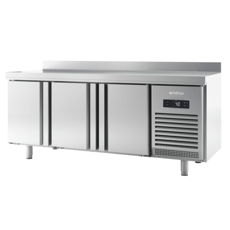 Masa rece cu 3 usi, volum 385 lt, rebord 100 mm la perete, temperatura de lucru -2°C +8°C, gaz refrigerant R290, clasa climatica 5 - agregat tropicalizat +40°C, picioare din inox reglabile pe inaltime, structura inox AISI304, 3 polite interne 325x430 mm ajustabile in inaltime, clasa de eficienta energetica A+, motor cu inverter, consum zilnic 1,56kW.