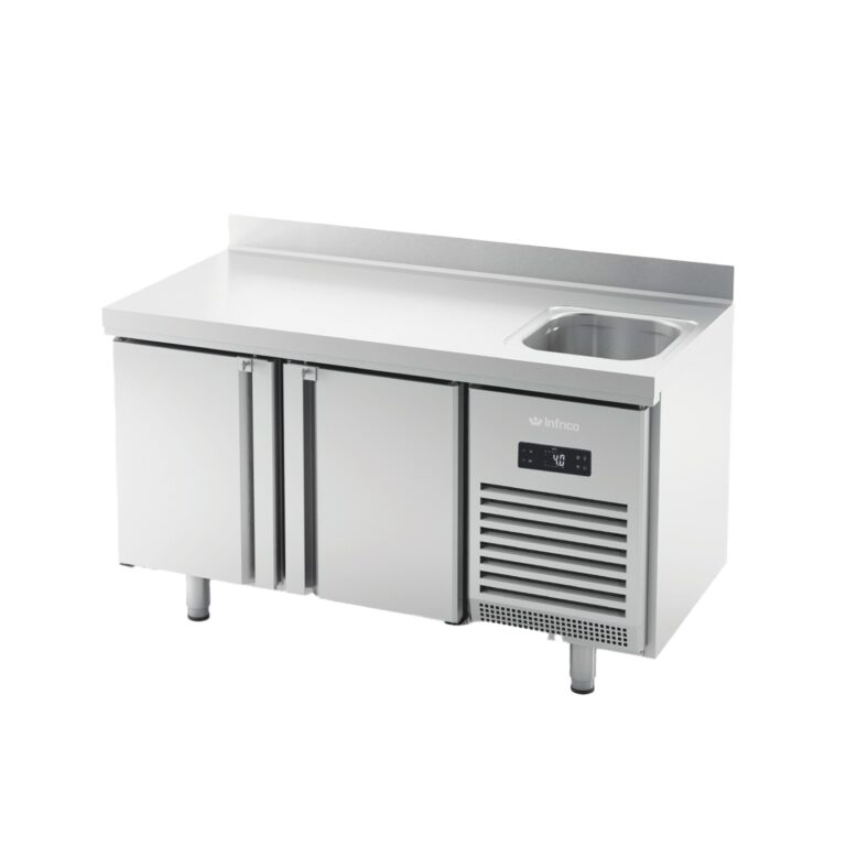 Masa rece cu 2 usi si spalator, volum 250 lt, rebord 100 mm la perete, temperatura de lucru -2°C +8°C, gaz refrigerant R290, clasa climatica 5 - agregat tropicalizat +40°C, picioare din inox reglabile pe inaltime, structura inox AISI304, 2 polite interne 325x430 mm ajustabile in inaltime, spalator 399x399 mm, clasa de eficienta energetica A+, motor cu inverter, consum zilnic 1,35kW.