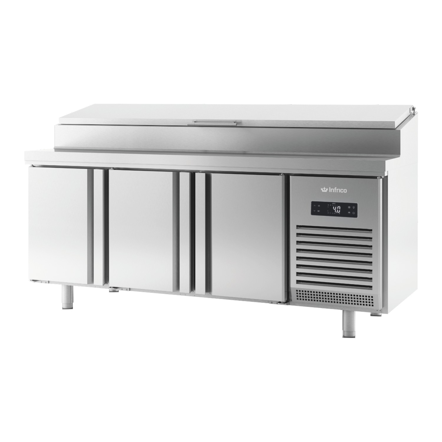 Salatiera cu 3 usi, volum 385+70 lt, capac rabatabil cu maner, temperatura de lucru 0°C +6°C, clasa climatica 4 - agregat tropicalizat +38°C, gaz refrigerant R290, picioare din inox reglabile pe inaltime, structura inox AISI304, 3 polite interne 325x430 mm ajustabile in inaltime, clasa de eficienta energetica A+, motor cu inverter.