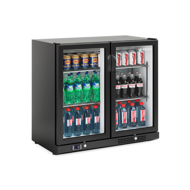 Vitrina refrigerata pentru bauturi, 2 usi batante, capacitate 193Lt, structura otel plastifiat negru la exterior si gri la interior, 2 rafturi incluse pentru fiecare usa, tava de evaporare, geamuri duble, racire ventilata, iluminare interioara, temperatura +4/+12°C, compresor 1/5 HP, control digital, gaz refrigerant R-290, decongelare automata.