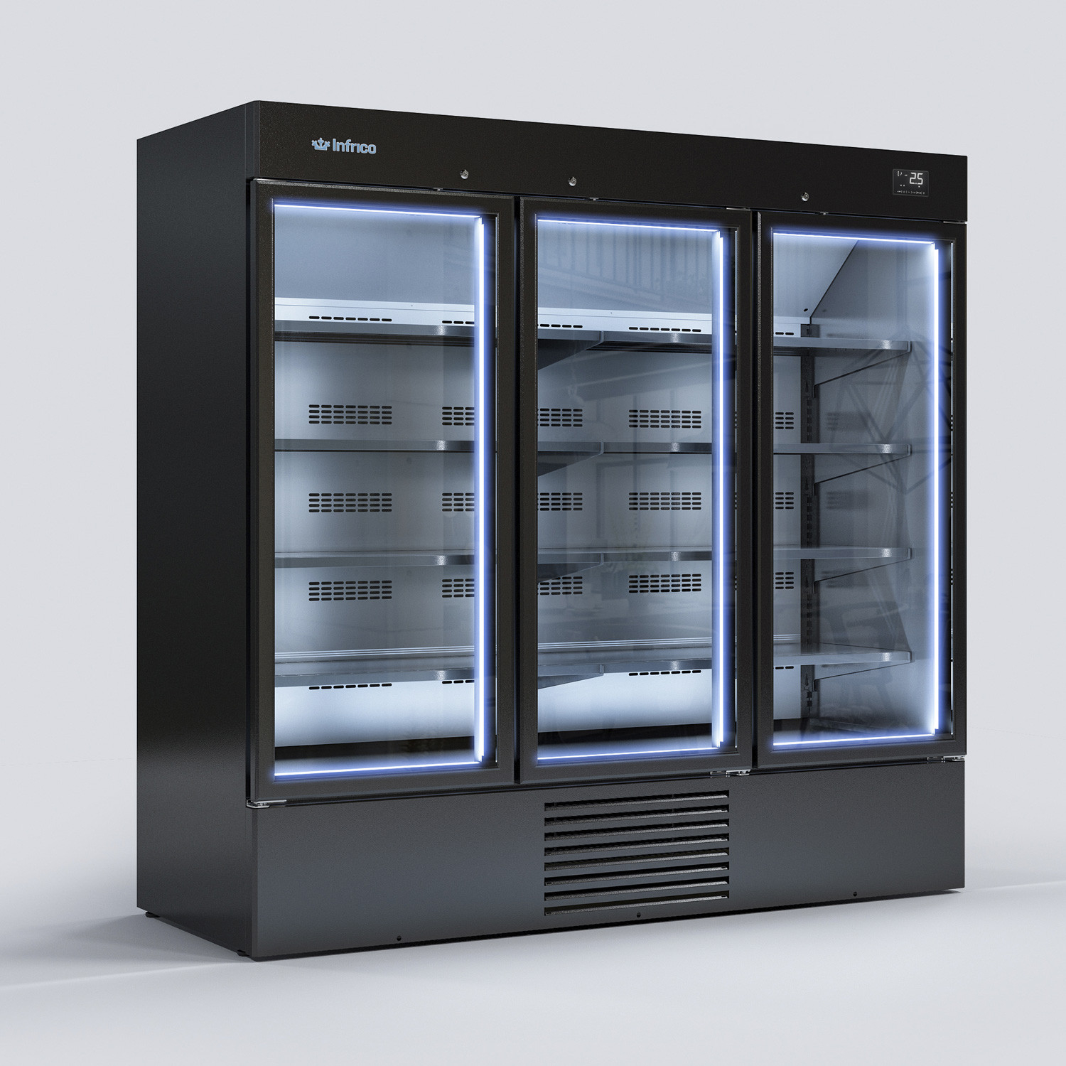 Vitrina speciala frigorifica cu 3 usi de sticla, iluminare interna cu LED, structura exterioara si interioara din otel plastifiat culoare alba(culoare neagra disponibila fara cost suplimentar), interiorul poate fi culoare neagra fara pret suplimentar, volum intern 20310 lt, usa batanta izolata cu geam dublu tip termopan pentru izolatie superioara, temperatura de lucru -18ºC, 4 polite interne pentru fiecare usa ajustabile in inaltime cu rezistenta foarte mare la greutate, clasa climatica 4 - motor tropicalizat pentru functionare la temperatura ambientala +38°C, racire ventilata, agent refrigerant ecologic R290, clasa de eficienta energetica D, consum in 24 ore 28kW, control electronic, decongelare automata, picioare reglabile in inaltime.