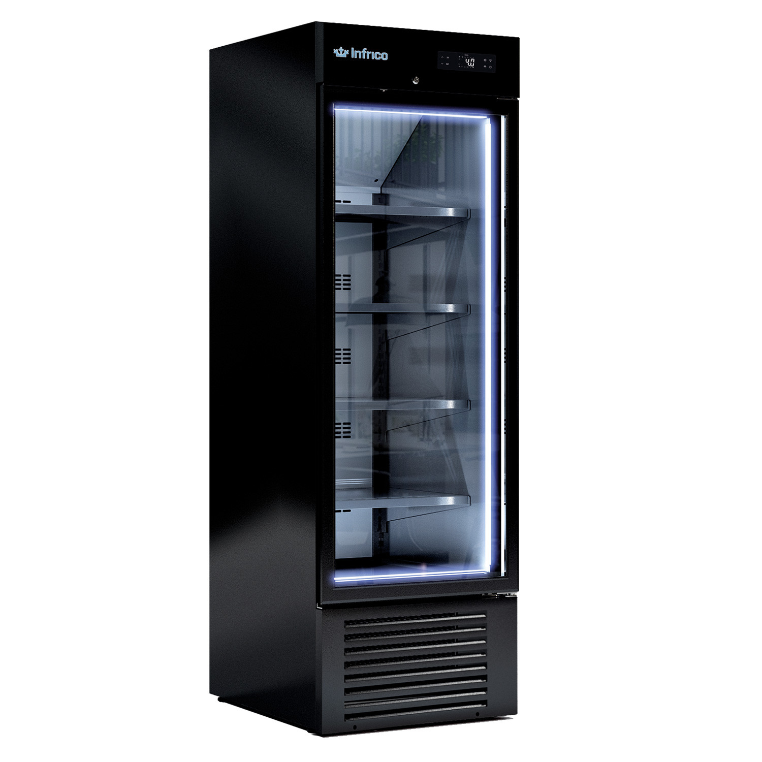 Vitrina speciala pentru bauturi cu 1 usa de sticla, iluminare interna cu LED, structura exterioara si interioara din otel plastifiat culoare alba(culoare neagra disponibila fara cost suplimentar), interiorul poate fi culoare neagra fara pret suplimentar, volum intern 500 lt, usa batanta izolata cu geam dublu tip termopan pentru izolatie superioara, temperatura de lucru -18°C, 4 polite interne pentru fiecare usa ajustabile in inaltime cu rezistenta foarte mare la greutate, clasa climatica 4 - motor tropicalizat pentru functionare la temperatura ambientala +38°C, racire ventilata, agent refrigerant ecologic R290, clasa de eficienta energetica C, consum in 24 ore 8,23kW, control electronic, decongelare automata, picioare reglabile in inaltime.