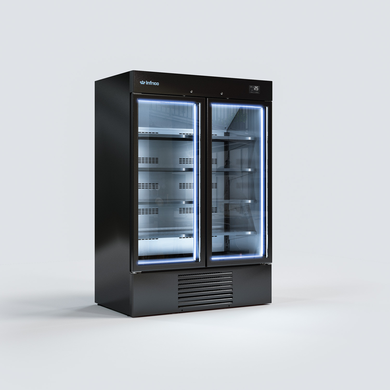 Vitrina speciala pentru bauturi cu 2 usi de sticla, iluminare interna cu LED, structura exterioara si interioara din otel plastifiat culoare alba(culoare neagra disponibila fara cost suplimentar), interiorul poate fi culoare neagra fara pret suplimentar, volum intern 1310 lt, usa batanta izolata cu geam dublu tip termopan pentru izolatie superioara, temperatura de lucru +4°C /+8°C, 4 polite interne pentru fiecare usa ajustabile in inaltime cu rezistenta foarte mare la greutate, clasa climatica 4 - motor tropicalizat pentru functionare la temperatura ambientala +38°C, racire ventilata, agent refrigerant ecologic R290, clasa de eficienta energetica C, consum in 24 ore 6,8kW, control electronic, decongelare automata, picioare reglabile in inaltime.