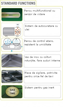 Masina lipit caserole profesionala, structura din otel inoxidabil, interior din otel inoxidabil cu colturi rotunjite, injectie gaz la ralanti, panou de control digital LCD, sistem pentru gaz inert, sistem de autocuratare cu ulei, placa de sigilare, panou de conntrol etans cu rezistenta la umiditate, etanasare pneumatica printr-un piston de 3Bar, senzor specific VACCUM-GAS pe placa electronica dotata cu roti, presiune maxima 3/4Bar.