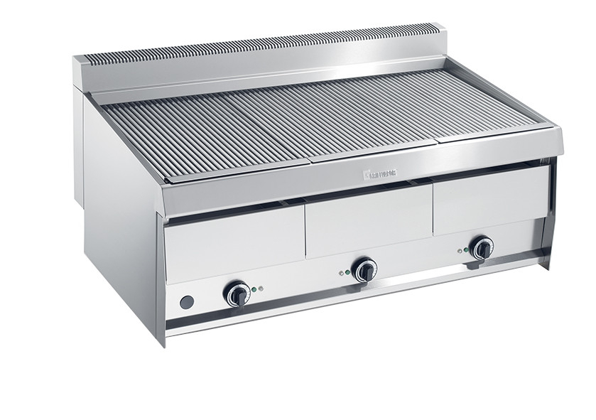 Gratar electric model banc, structura din otel inoxidabil, 3 zone independente de gatit, zona de gatit cu temperatura reglabila, sertar cu colector de apa, umplere manuala cu apa, suprafata de gatit rabatabila, butoane ergonomice rezistente, dimensiun suprafata de gatit 1155x530mm.