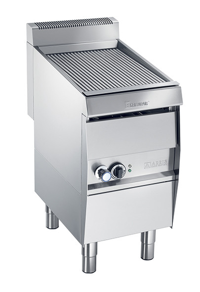 Gratar elecitrc pe suport neutru inchis, structura din otel inoxidabil, 1 zona independenta de gatit, zona de gatit cu temperatura reglabila, sertar cu ghidaje glisante dotat cu colector de apa, conexiune la apa, umplere manuala, suprafata de gatit rabatabila, dimensiuni placa de gatit 390x530mm.