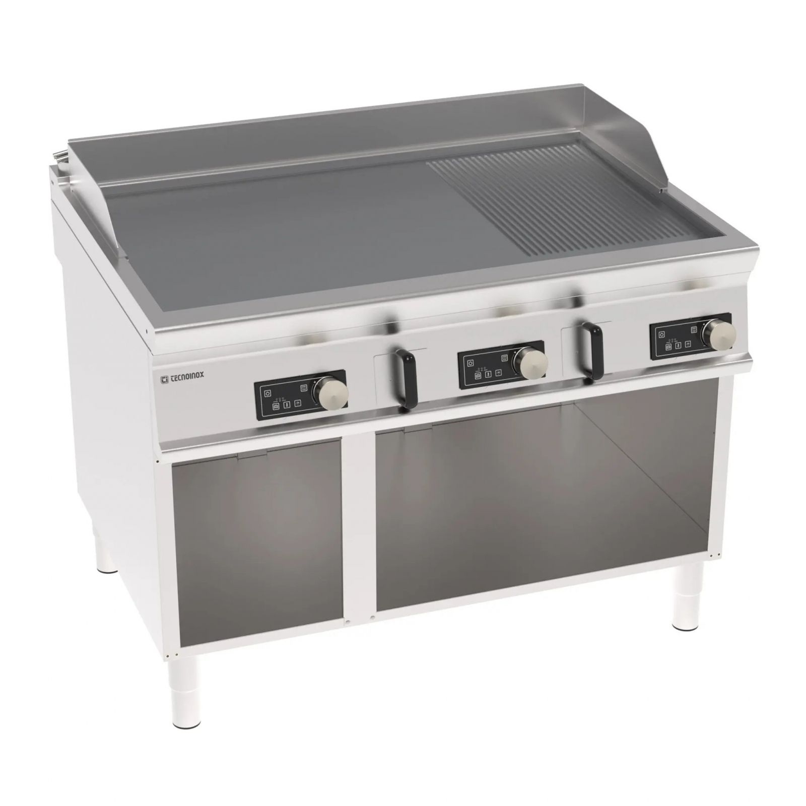 Gratar electric cromat/striat 1/3, pe suport neutru deschis, panou de control electronic, structura inox AISI304 cu grosime de 2 mm a blatului superior ce are protectie la apa IPX4, termostat de siguranta, temperatura de lucru 60÷270 °C, dimensiuni placa de lucru 1130x690 mm, rebord la perete si protectii laterale inalte detasabile, picioare reglabile in inaltime.