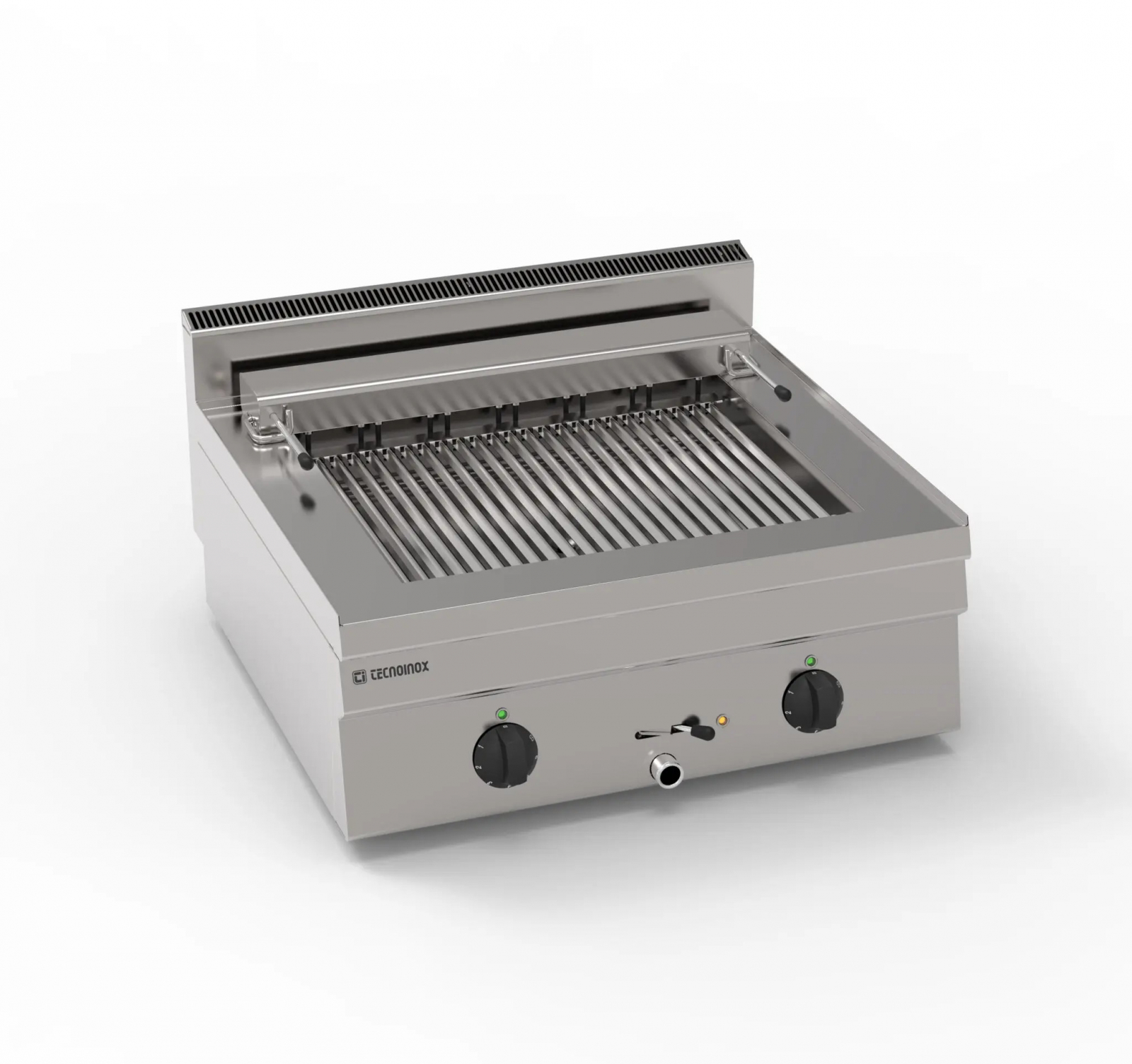 Gratar electric cu apa model banc cu 2 zone independente, structura din inox AISI304, sistem de cuplare modul cu îmbinări laterale exterioare, panou de control și panouri laterale din oțel inoxidabil, elemente de încălzire blindate basculante din oțel inoxidabil, regulator de energie, micro intrerupator de siguranta in pozitia ridicata a elementelor de incalzire, umplere manuală cu apă, dimensiuni suprafata de gatit 500x400mm,  compartiment tehnic pentru a facilita conectarea la rețeaua de electricitate, greutate 31,5Kg, picioare reglabile in inaltime.