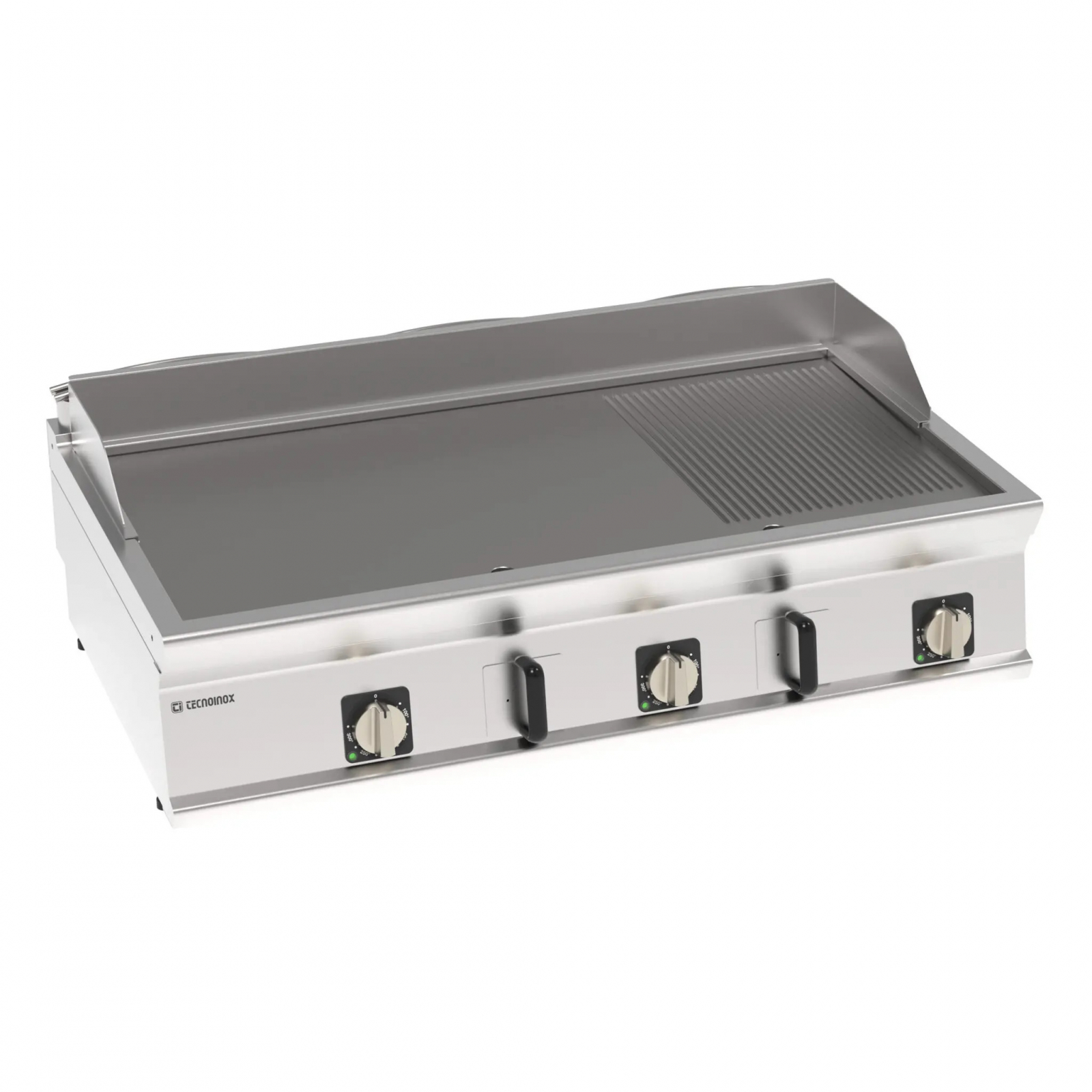 Gratar neted/striat 1/3 electric de banc, temperatura de lucru 60÷270°C, sertar colectare grasimi, structura inox AISI304, panou frontal detasabil, butoane foarte solide, 3 zone independente de lucru, 1 zona de gatit striata, dimensiuni placa de lucru 1130x560 mm, protectie perimetrala inalta detasabila inclusa, greutate 123 Kg, picioare reglabile in inaltime.