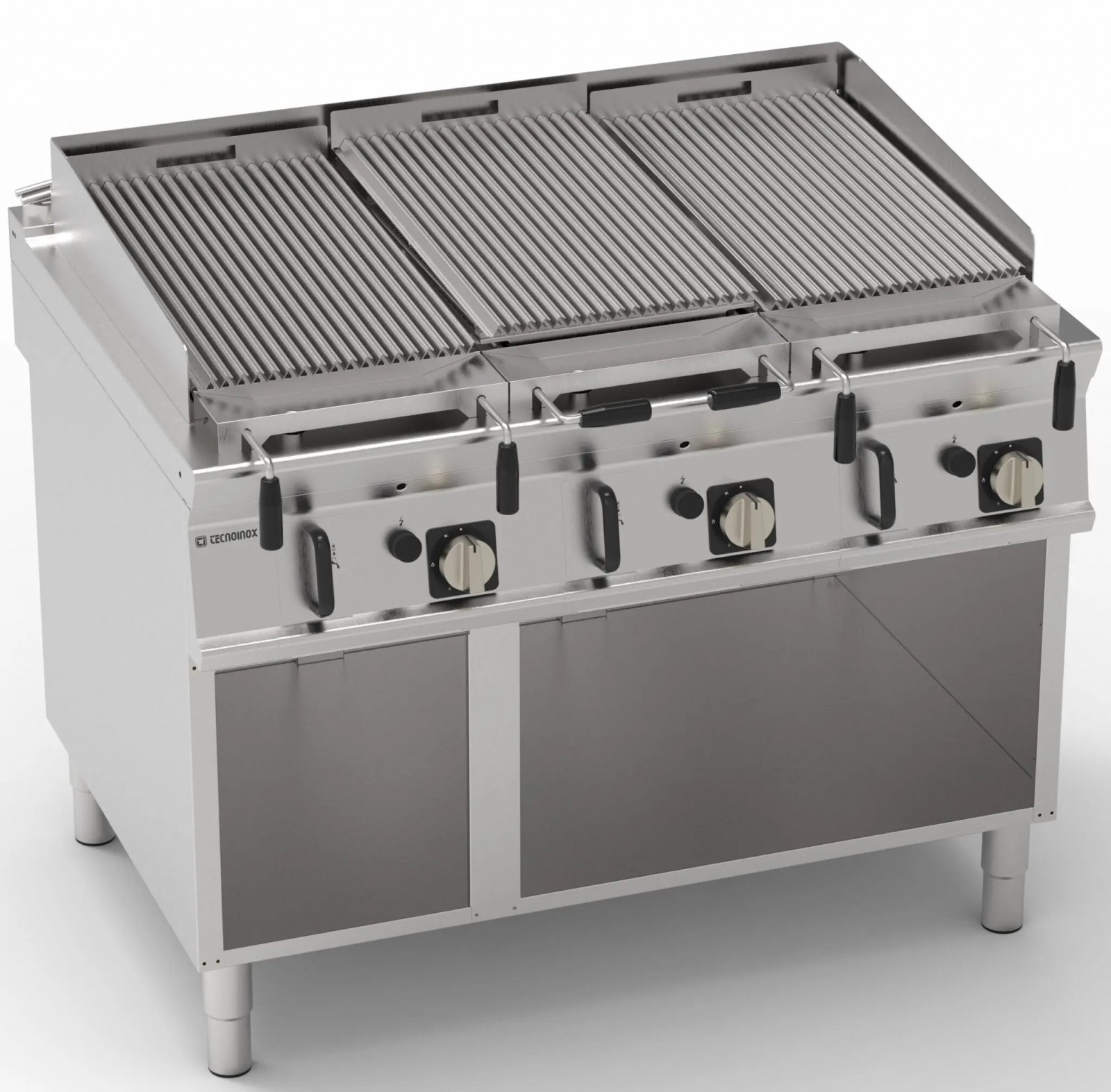 Gratar gaz cu placa striata din roca pe suport neutru deschis, 3 zone independente de gatit, structura inox AISI304 cu grosime de 2mm a blatului superior ce are protectie la apa IPX4, grilajele sunt reglabile in 2 pozitii cu tije de ridicare distantate de sursele de caldura, arzator perforat diferentiat pentru o distributie imbunatatita a caldurii, usor demontabil pentru curatare, aprindere piezoelectrică cu protectie la apa, sertar de colectare a prafului pentru fiecare zonă de gătit, detașabil de pe panoul de comandă, arzător pilot și termocuplu de siguranță, bazin de canelare și sertar pentru colectarea grăsimilor și lichidelor, sertarul de sub arzătoare are un dublu scop, colectează grăsimea și reziduurile de gătit pentru o curățare fără efort, buton solid cu rezistenta indelungata, reglarea căldurii printr-un robinet cu supapă, compartiment tehnic pentru conectare usoara la reteaua de gaz, picioare reglabile in inaltime.