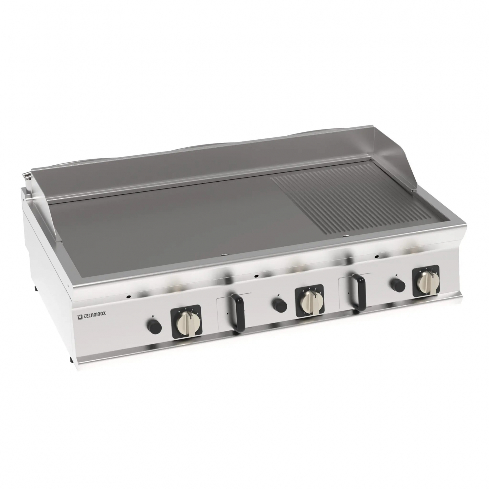 Gratar neted/striat 1/3 gaz de banc, temperatura de lucru 60÷300°C, sertar colectare grasimi, structura inox AISI304, panou frontal detasabil, butoane foarte solide, 3 zone independente de lucru, 1 zona de gatit striata, dimensiuni placa de lucru 1130x560 mm, protectie perimetrala inalta detasabila inclusa, picioare reglabile in inaltime.
