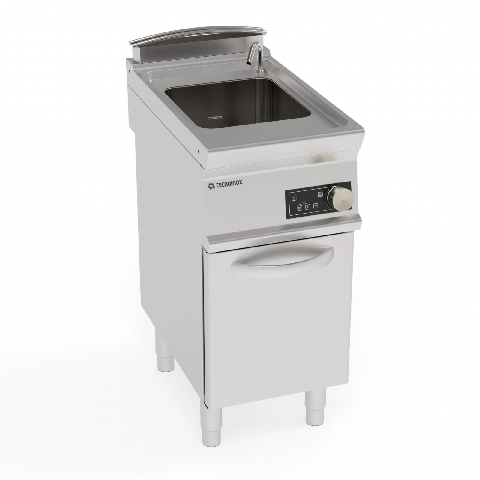 Masina de fiert paste electrica 1 cuva GN2/3 pe suport neutru inchis cu 1 usa, strucutura din inox AISI 304, capacitate 24Lt, mașinile de gătit paste mai sunt folosite si pentru a fierbe orezul, legumele, carnea și alte produse, panou de control electronic, programul de gătit poate fi salvat, creând astfel rețete standardizate, blat de lucru ambutisat cu un rezervor de gătit presat si sudat, dimensiuni cuva 300,5x340,1x300,3h, incalzire prin elemente de incalzire blindate din aliaj, controlul umplerii cu apă în interiorul cabinei, termostat de siguranta, dozator de apă pe partea din spate a blatului de lucru, greutate 39Kg, picioare reglabile in inaltime.