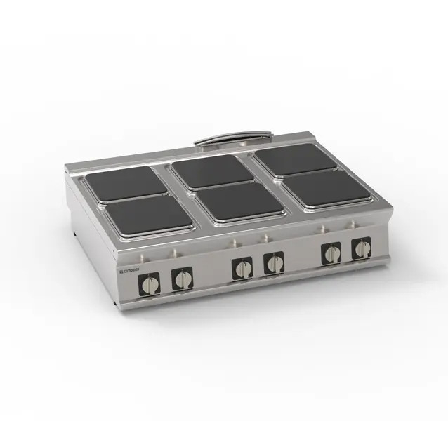 Masina de gatit electrica cu 6 plite patrate, structura integrala din inox AISI304, putere plita 6x4kW, placi electrice din fonta fixate ermetic, dimensiune plita 300x300mm, indicatoare luminoase ce indica functionarea, butoane foarte solide si rezistente in timp, greutate 112Kg, picioare reglabile in inaltime.