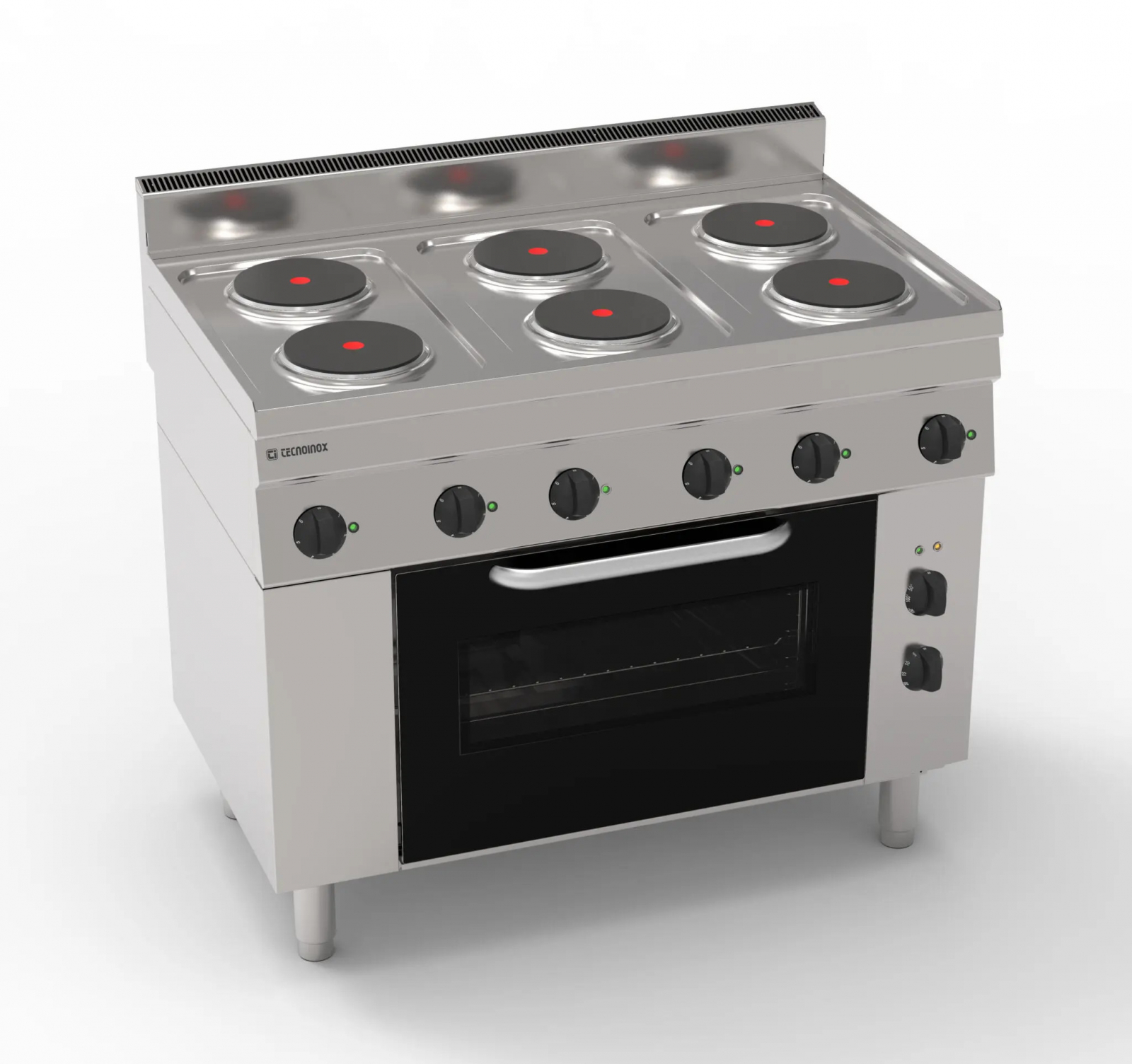 Plita electrica 6 zone independente si cuptor, structura din inox AISI304, blat adanc cu colturi rotunjite pentru igiena maxima si curatare usoara, comenzi de încălzire și comenzi separate pentru fiecare placă, placi fixate ermetic, lumini care avertizează când plăcile sunt aprinse, sistem de cuplare modul cu îmbinări laterale exterioare, putere placa 6x2kW, cuptor electric cu convectie, usa cuptor cu 2 geamuri din sticla securizata, garnitura detasabila din silicon, control termostatic, putere cuptor 2,5kW, capacitate 4 GN 1/1, greutate 83Kg, picioare reglabile in inaltime.