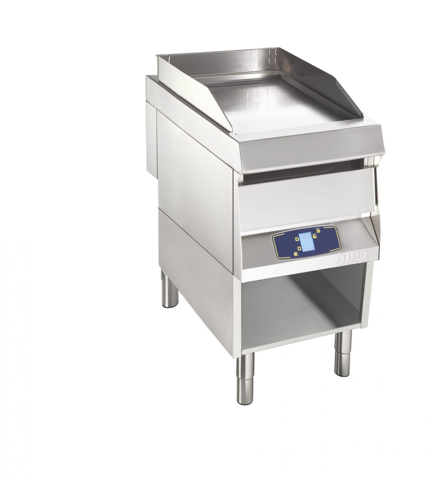 Gratar electric digital pe suport neutru deschis, strcutura din otel inoxidabil, structura de sustinere include o suprafata de gatit plana cu grosime de 3mm, si o alta suprafata de gatit cu grosime de 25mm, cadru de protectie detasabil impotriva stropirii, termostat de siguranta, temperatura reglabila de gatit pana la 280°C, sonda optional, sertar detasabil pentru colectarea grasimii cu o capacitate intre 2-10lt, panou de control digital, dimensiuni placa 340x710mm, picioare reglabile in inaltime.