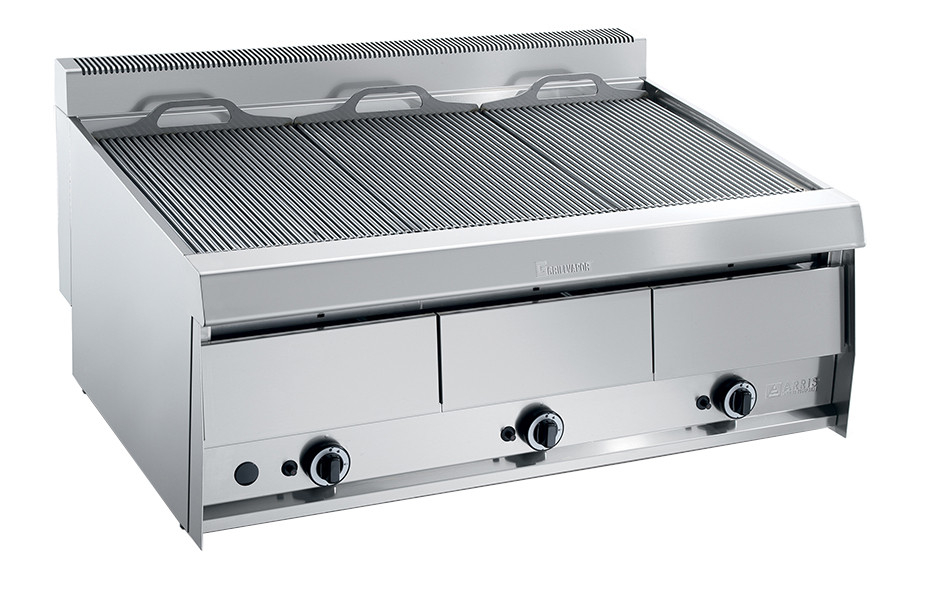 Gratar gaz model banc, structura din otel inoxidabil, 3 zone independente de gatit, aprindere piezoelectrica, arzatoare echipate cu flacara pilot si termocupla de siguranta, zona de gatit cu temperatura reglabila, sertar de colecate apa cu umplere manuala, dimensiuni placa de gatit 1155x670 mm.