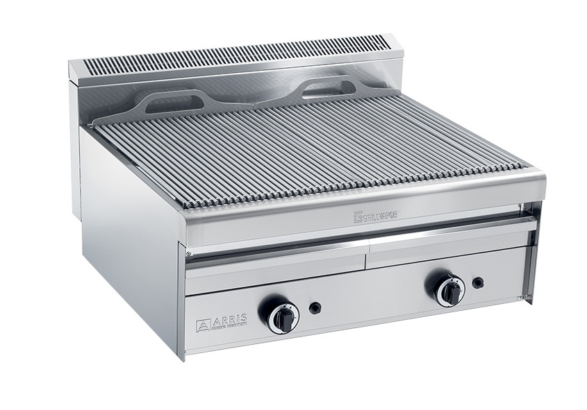 Gratar gaz model banc, structura din otel inoxidabil, 2 zone independente de gatit, suprafata de gatit cu temperatura reglabila, gratare de gatit din bare tip grilaj, aprindere piezoelectrica, arzatoare echipate cu flacara pilot si termocupla de siguranta, sertar cu colector de apa cu umplere manuala, butoane foarte rezistente, dimensiuni suprafata de gatit 760x550mm.