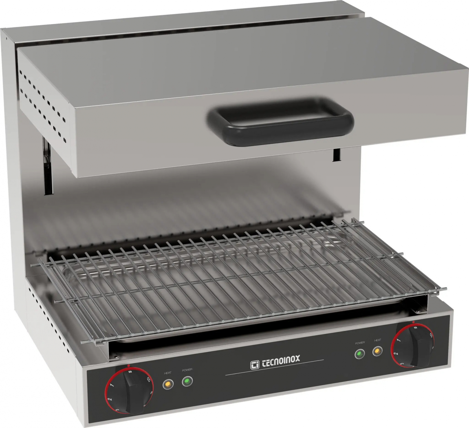 Salamndra electrica cu 2 zone de gatit, structura din inox AISI304, placă mobilă superioară, încălzire prin elemente de încălzire blindate, elementele de încălzire pot fi înclinate pentru a facilita întreținerea, controlul temperaturii prin regulator de energie, maner din duroplast rezistent la caldura, dimenisuni suprafata de gatit 600x350mm, greutate 46,9Kg, picioare reglabile in inaltime.